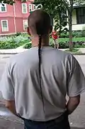 Hair is worn long and gathered up into a ponytail, often braided. It was worn traditionally by the Manchu people of Manchuria and certain Native American groups. |