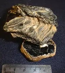 Crystal parting occurs when minerals break along planes of structural weakness due to external stress, along twin composition planes, or along planes of weakness due to the exsolution of another mineral. Parting breaks are very similar in appearance to cleavage, but the cause is different. Cleavage occurs because of design weakness while parting results from growth defects (deviations from the basic crystallographic design). Thus cleavage will occur in all samples of a particular mineral, while parting is only found in samples with structural defects. Examples of parting include the octahedral parting of magnetite, the rhombohedral and basal parting in corundum,[3] and the basal parting in pyroxenes.[1]