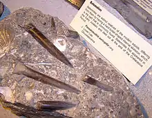 Passaloteuthis is a genus of belemnite, an extinct group of cephalopods.[1] Belemnites are typically known for having about 40 micro-hooks on each one of its appendage. However, Passaloteuthis is notable for being associated with a pair of mega-hooks known as onychites. These hooks are tentatively interpreted as male-specific features, though their exact function is still unknown.[2]