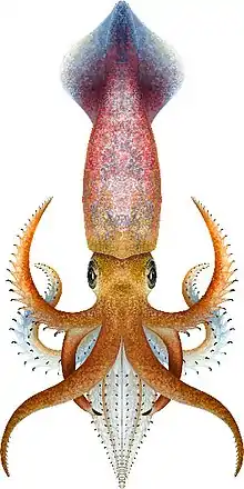Full-color reconstruction of Passaloteuthis with mega-hooks tentatively attached to the arm crown.