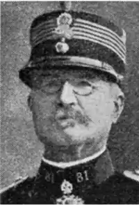 Diou's brigade was mobilised as part of General Louis Émile Taverna's 16th Army Corps and saw action in the Battle of Lorraine in August 1914.[3] The 143rd Infantry Regiment, part of Diou's brigade, were holding a defensive position in the Mulhewald Woods where they fought off German probing attacks on 19 August. Diou and Colonel Berguin, commander of the regiment, were commended for their coolness and courage under shellfire in this action.[9] Diou's brigade was ordered to attack German positions at Bénestroff the next morning at 4 am in heavy fog.[3] Before the attack could begin a German offensive launched from Cutting, Loudrefing and Mittersheim hit the regiment, supported by heavy artillery fire.[7] The 143rd's 2nd battalion was able to hold off the attack long enough for the 1st and 3rd battalions to gain defensive positions before withdrawing to join them.[9] Diou led a counterattack at 6 am that fared well initially, pushing the German troops back to a wooded area where, favoured by the terrain and the poor light, they were able to mount a strong defence.[9][7] Several charges were made by the French troops but they were eventually forced to withdraw under heavy defensive fire.[9][7] During this attack Diou, who led from the head of his troops with gun in hand, fell wounded in action.[9][3] His brigade's second in command, Commandant Jacques, was later killed in action in the same engagement and the 143rd also lost Colonel Berguin and most of their medical staff.[3][9] Diou died of his wounds on 23 August 1914 at Dieuze.[10][6]