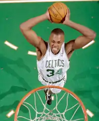 Pierce was selected with the 10th overall pick in 1998 NBA draft by the Boston Celtics, a team he despised growing up.[6] He scored 19 or more points in 10 of his first 11 contests. For the year, he averaged 16.5 points and finished third in the voting for Rookie of the Year honors. In his second season, he raised his scoring average to 19.5 points per game.[7] In the 2000–01 season, Pierce appeared in 82 games (all starts), averaging 25.3 points, 6.4 rebounds, 3.1 assists and 1.68 steals in 38.0 minutes. He led the Celtics and finished eighth in the league in points per game, fourth in total points (2,071). He was named NBA Player of the Month for March 2001 after averaging 30.3 points, 7.2 rebounds, 3.4 assists and 1.60 steals for the month.[5]