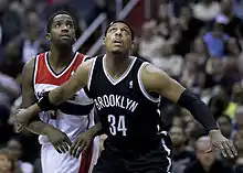 On June 28, 2013, the day of the NBA draft, the Boston Celtics and Brooklyn Nets reached a deal to trade Pierce, Kevin Garnett, and Jason Terry for future first-round picks in the 2014, 2016, and 2018 drafts and Kris Humphries, Gerald Wallace, Kris Joseph, MarShon Brooks, and Keith Bogans.[21] The deal was completed on July 12, 2013. Brooklyn also received D. J. White and the Celtics also received the right to swap first round picks in the 2017 draft.[22] Pierce convinced Garnett to waive his no-trade clause so that the deal could come to fruition.[23] At an introductory press conference with Garnett and Terry following the trade, Pierce stated, "We are championship driven... We made a lot of money in our careers. We have won a number of awards. At this point right now, we are about winning a championship. Brooklyn gives us the best opportunity."[24]