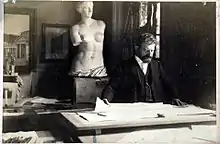 Wallot made his breakthrough when he won the second competition for the Reichstag building in Berlin victorious in 1882. With his colleague Friedrich von Thiersch, Wallot shared the competition's first prize, but his design was almost unanimously voted by the jury. In 1883, Wallot settled in Berlin to better monitor the construction. On 9 June 1884, the foundation ceremony was celebrated, and ten years later, on 5 December 1894, the capstone was set solemnly. The glazed iron dome above an official building, such as the Reichstag building, was astonishing and can be described as progressive in view of the further developments in architecture. Nevertheless, the construction was highly controversial throughout its construction period. With its original height of 67 meters, the dome was higher than that of the Stadtschloss, Berlin.[2] In the construction commission for the Reichstag building sat competitors who were inferior to him in the competition.[3] Kaiser Wilhelm II called the Reichstag building Reichsaffenhaus , (Reich monkey house),[4] which, however, also referred to the democratic legal form of parliamentarism.[5]