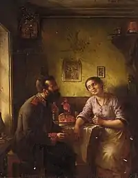 Despite this, his works were not popular, and were given poor reviews by the critics, who considered them to be vulgar.[2] As a result, he only showed his paintings at Academic exhibitions. From 1861 to 1866, he worked as a drawing teacher at several women's gymnasia, while giving private painting lessons. He retired with the rank of Collegiate Assessor in 1886.[1]