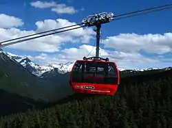 The Peak 2 Peak Gondola is a tricable gondola lift at Whistler Blackcomb Resort in Whistler, British Columbia, linking Whistler Mountain's Roundhouse Lodge with Blackcomb Mountain's Rendezvous Lodge. It is the first lift to join the two side-by-side mountains. It held the world record for the longest free span between ropeway towers—3.03 kilometres (1.88 miles) until 2017 when the Eibsee Cable Car exceeded it by 189m.[1] It is still the highest point above the ground—436 metres (1,430 feet.)[2] (A temporary aerial tramway in Switzerland used between 1979 and 1986 had larger span.) The Peak 2 Peak Gondola was built by the Doppelmayr Garaventa Group in 2007 and 2008 at a cost of CDN$51 million.[3] The Peak 2 Peak Gondola is the first Doppelmayr "3S" tri-cable lift in North America; there are four similar but smaller lifts in Europe which were built in 1991, 1994, 2002, 2004 and 2010 in Switzerland, Austria, France and Germany.[4] Whistler-Blackcomb has touted the gondola as an iconic attraction and uses it to transport skiers in the winter months as well as sightseers year round.
