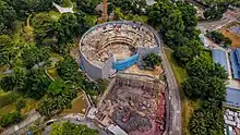 Originally unpainted on the outer façade, with the raw concrete visibly showing, the building was painted cream with orange details (such as the inner-rim connecting staircases) in 2008.