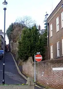 ![]() View up Watergate Lane with a dormer window forming part of the rear elevation of Pelham House just visible on the right of the trees | |