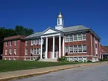A major expansion of the high school was dedicated February 5, 1932. The new construction mostly replaced the older building, which remained as a small wing on the north side of the building. The new building was faced in brick, Colonial in design, three stories high, with eight class rooms, and a combination gymnasium and auditorium seating 500. Altogether the combined grade and high school building consisted of about 40,000 square feet of space. The addition was constructed for $200,000 (USD) and designed for a capacity of 450 students. At the time of dedication, the total attendance was 265 students, of which 67 were in the high school.[18] In September 1934, Penfield High School had five "post graduates", four seniors, eleven juniors, thirty-seven sophomores, and forty-three freshmen.[19]