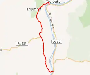 PA 127 begins at an intersection with US 62 in Hickory Township, Forest County, heading west on two-lane undivided Main Street. The route immediately crosses the Allegheny River into the residential community of West Hickory in Harmony Township. PA 127 turns south before turning northwest onto Fleming Hill Road and leaving West Hickory. The road curves north and enters dense hilly forests. PA 127 continues through more forests with a few areas of homes and fields, reaching a junction with the eastern terminus of PA 227 in Fagundus Corners. A short distance later, the road heads into Triumph Township in Warren County, becoming an unnamed road that passes through Fagundus and running through more dense forests. Along this stretch, PA 127 forms the west border of the Allegheny National Forest. The route turns northeast and becomes Babylon Hill Road before turning into Main Street as it enters the borough of Tidioute. Here, PA 127 passes homes before turning south onto Buckingham Street and running past businesses. The route crosses the Allegheny River again into Limestone Township and immediately ends at US 62.[2][3][4]