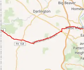 PA 251 begins at the Ohio state line in South Beaver Township, where the road continues west into Ohio as SR 154. From the state line, the route heads southeast on two-lane undivided Blackhawk Road, passing through forested areas with a few fields. PA 251 intersects PA 168 and continues east through more rural areas. Farther east, residential development near the road increases and it enters Chippewa Township, heading east-northeast. In this area, the route passes to the south of Beaver County Airport before it makes a turn southeast onto Darlington Road. PA 251 enters commercial areas, turning north onto Shenango Road and intersecting PA 51. Past this intersection, the route passes more development, turning east onto Oakville Road. Here, the road passes through wooded areas of homes, coming to a bridge over I-376. From this point, PA 251 becomes 37th Street Extension and passes more residences, entering the borough of West Mayfield. The road continues east through residential portions of the borough and enters commercial areas. Upon passing over Norfolk Southern's Fort Wayne Line, the route crosses into the city of Beaver Falls and becomes 37th Street, heading through residential and business areas before ending at PA 18.[3][4]