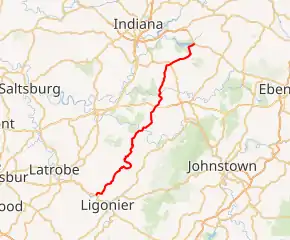 Pennsylvania Route 259 (PA 259) is a 33.4-mile-long (53.8 km) state highway located in Westmoreland and Indiana Counties in Pennsylvania. The southern terminus is at U.S. Route 30 (US 30) west of Ligonier. The northern terminus is at US 422 in Cherryhill Township on the border of Yellow Creek State Park.