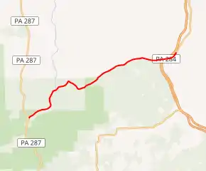 A road in the location of PA 284 first shows on maps as early as 1873.[3] PA 284 was first designated along its current alignment during the 1928 renumbering of state highways in Pennsylvania. The designation was done as a spur to the alignment of PA 84, which was designated from Piatt Township to the New York state line.[4] The entire alignment of PA 284 was paved by the Pennsylvania Department of Highways in 1932, including the bridge over Flooks Run and Blacks Creek.[5] However, the alignment has remained relatively unchanged since. In 1961, with the designation of Interstate 84, the alignment of PA 84 was re-designated as PA 287 to avoid duplication.[6] In 1974, PA 284 was adjusted for the construction of the new U.S. Route 15 alignment. This was adjusted in 1998 with the construction of U.S. Route 15 for preparations to convert the route to Interstate 99.[7]