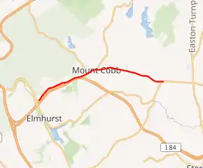 Pennsylvania Route 348 (PA 348) is a 7.21-mile-long (11.60 km) state highway located in Lackawanna and Wayne counties in Pennsylvania. The western terminus is at PA 435 near Elmhurst. The eastern terminus is at PA 590 near Hollisterville. PA 348 is a two-lane undivided road that runs through rural areas east of Scranton. From its beginning, the route runs a short distance to the north of Interstate 84 (I-84) before reaching an intersection with PA 247 in Mount Cobb. After this, PA 348 heads farther north from I-84 and leaves Lackawanna County for Wayne County, where it ends at PA 590.
