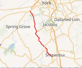 When routes were first legislated in Pennsylvania in 1911, what is now PA 616 was not given a number.[4] In 1928, the road between Glen Rock and US 30 west of York was designated as part of PA 216, which turned west from Glen Rock. At this time, the road was paved between Seven Valleys and US 30 while the portion between Glen Rock and Seven Valleys was unpaved.[5] PA 216 was realigned to head east from Glen Rock in 1930 and PA 616 was designated to run from PA 216 in Glen Rock north to US 30 west of York along the former portion of PA 216. By this time, the road between Railroad and Glen Rock was unnumbered, with the section between Seitzland and Glen Rock paved.[6] In 1937, PA 616 was extended south from Glen Rock to the Maryland border south of New Freedom, following its current alignment to Railroad before running along 2nd Street, Main Street, and Front Street.[7][8] The entire length of PA 616 was paved in the 1930s.[8] In the 1950s, the southern terminus of PA 616 was cut back to PA 516 (now PA 851) in Railroad, with PA 516 (later PA 851) replacing the route between New Freedom and Railroad and the remainder between the Maryland border and New Freedom becoming unnumbered.[9]