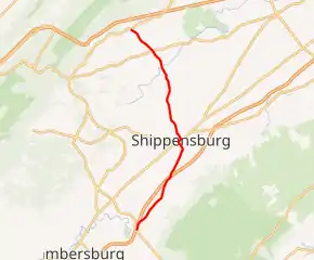 Pennsylvania Route 696 (PA 696) is a 16.0-mile-long (25.7 km) state highway located in Franklin and Cumberland Counties in Pennsylvania. The southern terminus is at PA 997 in Greene Township. The northern terminus is at PA 997 in Hopewell Township. PA 696 begins at PA 997 adjacent to an interchange with Interstate 81 (I-81) and heads northeast through farmland parallel to the interstate. The route turns north and has an interchange with I-81 before it continues into Shippensburg, where it has a brief concurrency with U.S. Route 11 (US 11) and PA 533 in the downtown area. Past Shippensburg, PA 696 runs north through more farmland and heads to Newburg, where it has a short concurrency with PA 641. The route heads northwest from here to its terminus at PA 997.