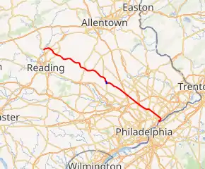 Pennsylvania Route 73 (PA 73) is a 62.32-mile (100.29 km) long east–west state highway in southeastern Pennsylvania. It runs from PA 61 near Leesport southeast to the New Jersey state line on the Tacony–Palmyra Bridge over the Delaware River in Philadelphia, where the road continues as New Jersey Route 73. The route passes through rural areas of Berks County, crossing U.S. Route 222 (US 222) in Maiden Creek before heading southeast through Oley and Boyertown. PA 73 continues into Montgomery County and intersects PA 100 in Gilbertsville and PA 29 in Schwenksville before it heads into the northwest suburbs of Philadelphia. The route passes through Skippack and intersects US 202 in Center Square, PA 309 in Springfield Township, and PA 611 near Jenkintown. PA 73 continues through Northeast Philadelphia on Cottman Avenue, crossing US 1 (Roosevelt Boulevard) and US 13 (Frankford Avenue) before coming to an interchange with Interstate 95 (I-95) near the Tacony–Palmyra Bridge.