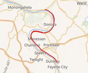 After this, the route narrows into a two-lane undivided road and turns northeast, passing under the bridge. PA 906 becomes an unnamed road and heads through more wooded areas at the bottom of a cliff with the CSX line and the Monongahela River paralleling it to the northwest. The road, along with the railroad tracks and the river, turn to the north, with the route widening to four lanes. PA 906 comes to the community of Webster, where it splits into another one-way pair that follows 2nd Street northbound and 1st Street southbound, with each road carrying two lanes. The route passes homes and businesses within the community, intersecting the eastern approach to the Donora-Webster Bridge. The one-way pair runs through more of the community before both directions of PA 906 rejoin and follow two-lane undivided North Road. The road continues northwest through more forested areas with occasional homes, with the railroad tracks and the river to the southwest. The route eventually turns more to the west.[2][4] PA 906 crosses into Forward Township in Allegheny County and becomes Rainbow Run Road, ending at an intersection with PA 136 in Milesville. At this point, Rainbow Run Road continues west as a part of that route.[2][5]