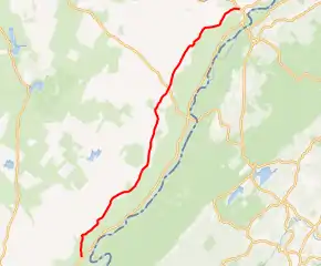 State Route 2001 begins at a blinker in Lehman Township, about 1-mile (1.6 km) north of the Monroe/Pike County border.[3] The road moves westward for a bit, turning towards the north to Milford at about 1-mile (1.6 km). Bushkill Falls Road becomes SR 2003, which goes on past Bushkill Falls, the Pocmont Resort and ending at Pennsylvania Route 402. A small local road, Broadhead Road, leaves to a sharp right soon after. Broadhead Road takes you to U.S. 209 going eastward. At this point, SR 2001 is in the Delaware Water Gap National Recreation Area, which is on the right side most of the route.[3] Little Egypt Road leaves to the right a little later towards the Tom's Creek Picnic Area and U.S. 209. Big Egypt Road, the twin to Little Egypt, leaves to the right later heading for the same area. Briscoe Mountain Road comes in from the right and becomes Sunset Road.