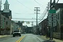 At this point, PA 987 turns east for a concurrency with PA 329 on Nor-Bath Boulevard, with the two routes continuing east through Jacksonville before turning northeast and passing to the east of a quarry, with the Nor-Bath Trail parallel to the east of the road. The road passes near a cement plant before it heads into the borough of Bath. Here, the road becomes Race Street and passes through woods before heading into residential areas. PA 329 reaches its eastern terminus at the PA 248 intersection, where PA 987 makes a turn east to follow PA 248 for a block on West Main Street, crossing the Monocacy Creek. A block west of PA 512, the two routes turn north onto South Chestnut Street, passing homes. At the Northampton Street intersection, PA 248 splits to the east and PA 987 continues north on North Chestnut Street. The route curves northwest through a mix of farm fields and homes as it leaves Bath. The road turns north and briefly passes through East Allen Township again before it enters Moore Township, becoming Monocacy Drive. PA 987 passes through wooded areas with some homes, crossing the Monocacy Creek again, before it curves northwest and passes through a section of the borough of Chapman, bypassing the center of the borough to the southwest. The route continues through a mix of farmland and homes before it reaches its northern terminus at PA 946 at the Cross Roads junction near the community of Klecknersville. Past this intersection, the road continues northwest as part of PA 946.[2][4]
