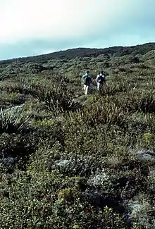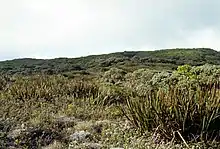 Pēpēʻōpae is located near the summit of Kamakou peak in eastern Molokaʻi at an elevation of about 4,800 feet (1,500 m) at 21°7′8″N 156°53′45″W.[1] Poorly draining acidic soil leaches of nutrients, rainfall that exceeds 300 inches (760 cm), cooler temperatures and high winds have resulted in a bog where the canopy has been reduced to plants that are only inches above the ground. Typical forest canopy trees such as ʻōhiʻa lehua (Metrosideros polymorpha) and ʻōlapa (Cheirodendron trigynum) can be found as groundcover, crawling along the surface.