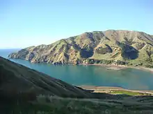 Pepin Island is 3.5 kilometres (2.2 mi) long, and up to 2.1 kilometres (1.3 mi) wide. It measures 5.18 square kilometres (2.0 sq mi) in area.[1] The highest point is Stuart Hill, which rises to 401 metres (1,316 ft).[2] The island is located on the northeast coast of Tasman Bay / Te Tai-o-Aorere, with the smaller indentation of Delaware Bay to the east. It is joined to the mainland by a naturally formed pathway made from boulders that have tumbled down nearby hillsides then been shaped into a causeway by the sea.[3]