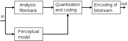 The input signal is decomposed into subsampled spectral components. For each sample an estimation of the actual masked threshold is derived using rules known from psychoacoustics. This is the perceptual model of the encoding system. The spectral components are quantized and coded, keeping the quantization noise below the masked threshold. Finally, the bitstream is formed.