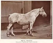 Percherons were first imported into the United States in 1839 by Edward Harris II of Moorestown, New Jersey. Only one of the initial four horses survived the ocean trip. Soon after, two stallions and two mares were imported; one mare died shortly after arrival and one stallion went blind and was retired within a year. Although the first importations of Percherons were less than successful, the remaining stallion owned by Edward Harris II, named Diligence, was credited with siring almost 400 foals. In 1851, three stallions were imported: Normandy 351, Louis Napoleon 281 and Gray Billy. Throughout their stud careers, each had significant influence on American draft horse stock.[14] In the mid-19th century in the United States, Percheron stallions were crossed with homebred mares to improve the local stock, resulting in thousands of crossbred horses.[15] After the American Civil War in the 1860s greatly reduced the number of horses, there was a significant need for large draft horses, especially in growing cities and in the expanding West.[11] Large numbers of Percherons were imported to the United States beginning in the early 1870s, and they became popular with draft horse breeders and owners.[7] In the 1880s, approximately 7,500 horses were exported to the United States.[12] This extensive importation lasted until 1893, when the US experienced a financial panic, and virtually no Percheron imports occurred between 1894 and 1898. In addition, many existing horses were lost as people were too poor to purchase or care for large draft horses. In 1898, importations began again as abruptly as they had ceased, with an average of 700 horses a year imported between 1898 and 1905. In 1906 alone, over 13,000 horses were imported to the United States from France.[11] In the American traveling circuses of the late 19th century and early 20th century, the Percheron was the most frequently seen draft horse. Drivers appreciated the breed's agility, stamina and quick-footed gait.[16]