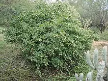 The four species of Pereskia as the genus is now circumscribed share many features in common with Leuenbergeria and Rhodocactus, which were formerly included in a broadly defined Pereskia. They are shrubs, trees or climbing vines, with maximum heights varying between 3 and 10 m. Unlike the great majority of species of cacti, they have persistent leaves. Like all cacti, they have spines borne on areoles. Their succulent leaves are longer than wide, reaching 11 cm by 5 cm in the case of P. aculeata. Their flowers are borne in small clusters or are solitary, except for P. aculeata which can have inflorescences of 70 or more individual flowers. P. aculeata has edible fruits, 1.5–2.5 cm in diameter; the other species have smaller fruits, only up to 6 mm in diameter in the case of P. horrida. Unlike Leuenbergeria, the stems of Pereskia delay forming bark and have stomata. Unlike Rhodocactus, there are no leaves on the areoles.[1][2][3]