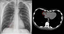 Since pericardial cysts are often asymptomatic, the most common diagnosis is through incidental finding on a chest x-ray.[1][2] When patients have symptoms, transthoracic echocardiogram is one of the first tests used to look for a pericardial cyst.[3] CT or MRI may also be used to diagnose pericardial cysts.[4][5][6] On CT and MRI a pericardial cyst will commonly appear as a round, fluid-filled structure surrounded by thin walls.[4][5][6] Diagnosis of a pericardial cyst can also be made before birth using ultrasound.[2]