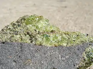Peridot (/ˈpɛr.ɪˌdɒt, -ˌdoʊ/ PERR-ih-dot, -doh), sometimes called chrysolite, is gem-quality olivine and a silicate mineral with the formula of (Mg, Fe)2SiO4. As peridot is a magnesium-rich variety of olivine (forsterite), the formula approaches Mg2SiO4. Its green color is dependent on the iron contents within the structure of the gem. Peridot occurs in silica-deficient rocks such as volcanic basalt and pallasitic meteorites. Peridot is one of only two gems observed to be formed not in the Earth’s crust, but in molten rock of the upper mantle. Gem-quality peridot is rare to find on Earth's surface due to its susceptibility to weathering during its movement from deep within the mantle to the surface.