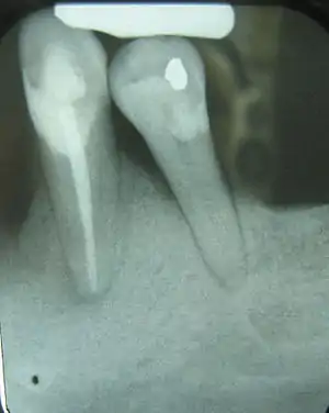 | Radiograph showing bone loss between the two roots of a tooth (black region). The spongy bone has receded due to infection under tooth, reducing the bony support for the tooth. | |