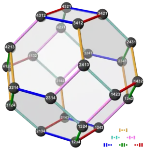 The image on the right shows the permutohedron of order 4, which is the truncated octahedron. Its vertices are the 24 permutations of (1, 2, 3, 4). Parallel edges have the same edge color. The 6 edge colors correspond to the 6 possible transpositions of 4 elements, i.e. they indicate in which two places the connected permutations differ. (E.g. red edges connect permutations that differ in the last two places.)