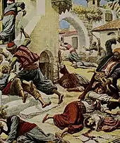 According to the later account of Antiochus of Palestine, whose perspective appears to be that of a Byzantine Greek and shows an antipathy towards the Jews,[77] thousands of Christians were massacred during the conquest of the city. Estimates based on varying copies of Strategos's manuscripts range from 4,518 to 66,509 killed.[78] Strategos wrote that the Jews offered to help them escape death if they "become Jews and deny Christ", and the Christian captives refused. In anger the Jews allegedly purchased Christians to kill them.[79] In 1989, a mass burial grave at Mamilla cave was discovered in by Israeli archeologist Ronny Reich, near the site where Antiochus recorded the massacre took place. The human remains were in poor condition containing a minimum of 526 individuals.[80]