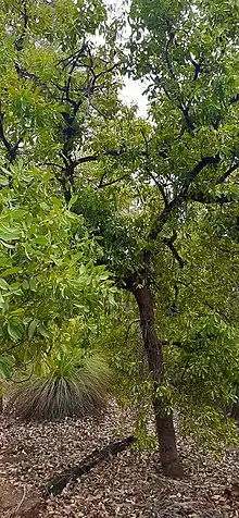 Snottygobble usually grows as an understorey shrub in forest dominated by jarrah or marri, often with Persoonia longifolia from which it is distinguished by its single trunk, large leaves with a narrow base and compact grey bark. It is found near the coast between Perth and Albany in the Esperance Plains, Jarrah Forest, Swan Coastal Plain and Warren biogeographic regions.[4][11]