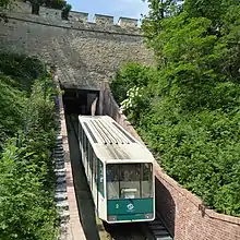 The Petřín funicular is a funicular railway in the Czech capital city of Prague. It links the Malá Strana district with the top of Petřín (Czech pronunciation: [ˈpɛtr̝̊iːn]) hill. The funicular has three stops: Újezd (at the bottom of the hill), Nebozízek (the middle station) and Petřín (at the top of the hill). The funicular operates daily from 9 am to 11:20 pm, interval is between 15 and 20 minutes.[1] On the funicular applies regular time tickets of Prague Integrated Transport.