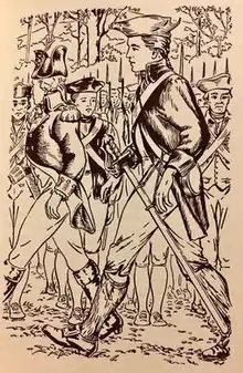 Francisco was sent home to Buckingham, Virginia to recuperate. He volunteered to spy on Tarleton and his horsemen, who were operating in the area. On this journey, he performed his best-known action: Francisco's Fight. He claimed to have defeated a band of Tarleton's Raiders and escaped with their horses. Legend has it that he killed or mortally wounded three of the eleven raiders. One night, nine of Tarleton's men surrounded Francisco outside of a tavern and ordered him to be arrested. They told him to give over his silver shoe buckles. Francisco told Tarleton's men to take the buckles themselves. When they began to seize his shoe buckles, Francisco took a soldier's saber and struck him on the head. The wounded soldier fired his pistol, grazing Francisco's side; Francisco nearly cut off the soldier's hand. Another enemy soldier aimed a musket at Francisco, but the musket misfired. Francisco grabbed it from the soldier's hands, knocked him off his mount, and escaped with the horse.[5] However, in his 1820 letter to the Virginia legislature, Francisco reported having killed one and wounded eight of the nine raiders, and captured eight of their nine horses.[3] In a brief 1829 petition to the United States Congress, he claimed to have dispatched or killed three Tarleton raiders and frightened the other six away while capturing eight of their horses.[6] Francisco was ordered by his commanding officer to join the army in 1781 at Yorktown; he did not fight but was a witness to the British surrender.