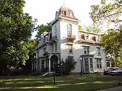 The Peter Van Dyke House is an imposing Second Empire structure sheathed in clapboard, with a four-story tower. It is profusely decorated with a porch, small balconies, and differently designed brackets along the eavesline, The mansard roof has arched or steeply gabled projecting dormers. The front entrance is located in the base of the tower, and is covered with a small porch with chamfered columns and decorative cornice. The entryway is through paired doors beneath a curved transom containing etched ruby glass. Paired windows in an arched frame are in the second story above, while the third floor has arched windows and the fourth ocular windows.[2]