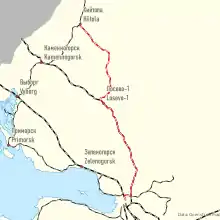 The railway connected Hiitola (Khiytola) on the Vyborg–Joensuu railway with Finland Station in St. Petersburg, bypassing the Riihimäki–Vyborg–Saint Petersburg trunk line of Finnish railways. Construction of the railway had been completed by January 1917, although some works continued until 1919. The line was constructed from Rautu (Sosnovo) to Hiitola, as single line railway which is used in both directions.[2] The part of the railway south of Raasuli (Orekhovo) was on the Russian side of the Finnish-Russian border.