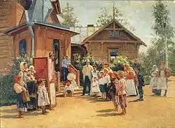 Petrushka begins with a festive orchestral introduction based, in part, on historical Russian street-hawkers' cries.[8] The curtain rises to reveal St. Petersburg's Admiralty Square during the 1830s. The stage set (also by Benois) depicts several hucksters' booths, a ferris-wheel, a carousel, and (upstage center) a puppet theater. A crowd has gathered for the Shrovetide Fair (known as Maslenitsa), the carnival (analogous to Mardi Gras) preceding Lent.