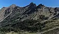 Petunia Peak is set in the northeastern Olympic Mountains, and is situated on the boundary shared by Olympic National Park with the Buckhorn Wilderness, on land partially managed by the Olympic National Forest. Precipitation runoff from Petunia Peak drains into tributaries of the Dungeness River, and topographic relief is significant as the east aspect rises 3,750 feet (1,143 m) above the river in approximately 1.7 mile, and the west aspect rises 2,000 feet above Royal Basin in less than one mile. Old-growth forests of Douglas fir, western hemlock, and western redcedar grow on the lower slopes surrounding the peak. Like the town of Sequim 17 miles to the north, Petunia Peak lies in the rain shadow of the Olympic Mountains. It is also called "Petunia Peaks", as a higher summit known as North Petunia Peak (6,998 ft) rises 0.6 mile (1 km) to the north.[4][5] This landform's name has not been officially adopted by the U.S. Board on Geographic Names, so the mountain is not labeled on USGS maps.