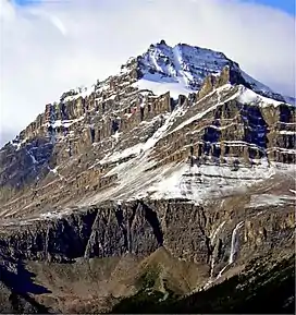 Like other mountains in Banff Park, Peyto Peak is composed of sedimentary rock laid down during the Precambrian to Jurassic periods.[4] Formed in shallow seas, this sedimentary rock was pushed east and over the top of younger rock during the Laramide orogeny.[5]