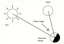 Phase angle in astronomical observations is the angle between the light incident onto an observed object and the light reflected from the object. In the context of astronomical observations, this is usually the angle Sun-object-observer.