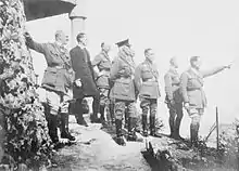 In World War I, Chetwode served on the Western Front: his brigade helped cover the retreat from the frontier, and checked the pursuing Germans at Cerizy on 29 August 1914.[2] After taking part in the First Battle of Ypres in October 1914, he was appointed General Officer Commanding 2nd Cavalry Division with promotion to temporary major-general on 15 July 1915[13] and to substantive major-general on 1 January 1916.[14] With the war in Europe become bogged down in trench warfare, Chetwode was lucky to be transferred to the Palestine where he was given command of the Desert Column and promoted to temporary lieutenant general with effect from 22 November 1916.[15] He led the corps at Rafa in January 1917 and at the First Battle of Gaza in March 1917.[16] When Edmund Allenby took command of the Allied forces in Palestine in June 1917, Chetwode was promoted to command of XX Corps.[16] He led his corps to military success at the Battle of Beersheba in October 1917 and at the Battle of Jerusalem in November 1917.[17] During the Sinai and Palestine campaign he was mentioned in despatches eight times.[16]