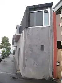 After building the Wedge House in 1999, Harmer Architecture received both the Commendation for Outstanding Architecture award from the RAIA and the Winner Wools of New Zealand award from Interior Design Awards.[4] Wedge House is one of Melbourne's narrowest buildings with only 1.8 meters in width and 16 meters in length. The major materials used were concrete and rubber, but stainless steel linings and ionized copper sheets were also used for the main entrance door and windows. Rollo mentioned that "The two-storey house responds to the shape of the wedge in both plan and elevation [and] its design almost reflects seamlessly to a streetscape of two-storey and single-storey Victorian homes and buildings."[8]