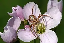 Philodromus aureolus, the wandering crab spider,[2] is a mainly European running crab spider of the family Philodromidae.[1] The taxonomy of the species group named after Philodromus aureolus is in a state of flux and a number of new species have recently been recognised.[3]