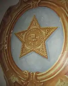 The Philomathean Hall is the oldest building[24] in the Erskine College-Due West Historic District. As such, it is a contributing property in the National Register of Historic Places.[25] It was constructed in 1859, under the direction of architect Thomas Veal. The building was constructed in the Italian Renaissance Revival style. The two-story stuccoed building features Corinthian pilasters, a pedimented pavilion, recessed balustrades and a Palladian window.[26] The Hall demonstrates the influence of Andrea Palladio as it bears close resemblance to the Villa Capra "La Rotonda" and the Villa Porto (Vivaro di Dueville). Palladio's geometrically formulaic design is echoed in the Philomathean Hall's 50x40 footprint, symmetrically placed windows and interior floor plan that conforms to the windows exterior placement. The open second floor meeting hall celebrates this geometry with its painted high ceiling, flanking fireplaces, and 14 symmetrically placed windows, while the downstairs rooms are dimensioned to match the window placement, a schematic that still challenges contemporary architects. The architectural similarities between the Hall and colonial American buildings, such as those at Mount Vernon, Monticello, and the White House, are thematic of the early 19th century.[27] Additionally, the Hall is aesthetically tied to other South Carolina buildings. It possesses characteristics similar to those found in Hibernian Hall and Drayton Hall. Leaks in the internal gutter have caused significant damage to the jewel-box painting on the ceiling of the great hall on the second floor, which was added in the 1912 J.J. Darlington renovation.[28][29] The ceiling and wall frescoes were painted by Italian painter Alfredo Lanzer.