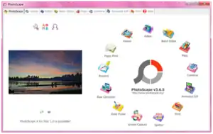 PhotoScape is a graphics editing program, developed by MOOII Tech, Korea. The basic concept of PhotoScape is 'easy and fun', allowing users to easily edit photographs taken from their digital cameras or even mobile phones. PhotoScape provides a simple user interface to perform common photo enhancements including color adjustment, cutting, resizing, printing and GIF animation.[1][2] Photoscape operates on Microsoft Windows systems and Mac. It is available on Linux systems as a Snap package.[3] The default languages are English and Korean, with additional language packages available for download.