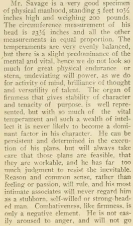 Phrenograph of Charles Roscoe Savage performed by Nephi Schofield in 1904. Published in the phrenological journal, the Character Builder.[84]