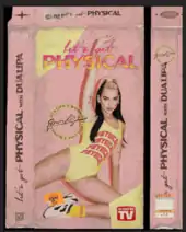 A 1980s-inspired workout video for "Physical" was released to YouTube on 6 March 2020.[147] It was directed by Daniel Carberry and filmed in New York City on 17 February 2020.[148][149] The video was created as Lipa desired her own Jane Fonda-like workout video.[2] Branded merchandise from the video was made available for purchase on Lipa's website the same day as the video's release.[150][147] A version of the video mixed entirely in Sony's 360 Reality Audio from the usage of MPEG-H 3D Audio was released through Amazon Music, Tidal and Deezer.[151] Lipa teased the release with several images on social media and a mock VHS cover art.[150]